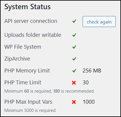 System Status PHP Time Limit and PHP Max Input_